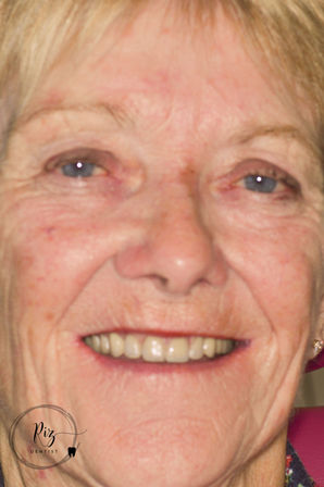 Following the successful healing of the extraction sites, we were able to move forward and create the definitive dentures. This involved an acrylic upper full denture and a lower full denture supported by the two implants. These new dentures not only addressed the patient's functional concerns but also significantly improved her smile and facial appearance.